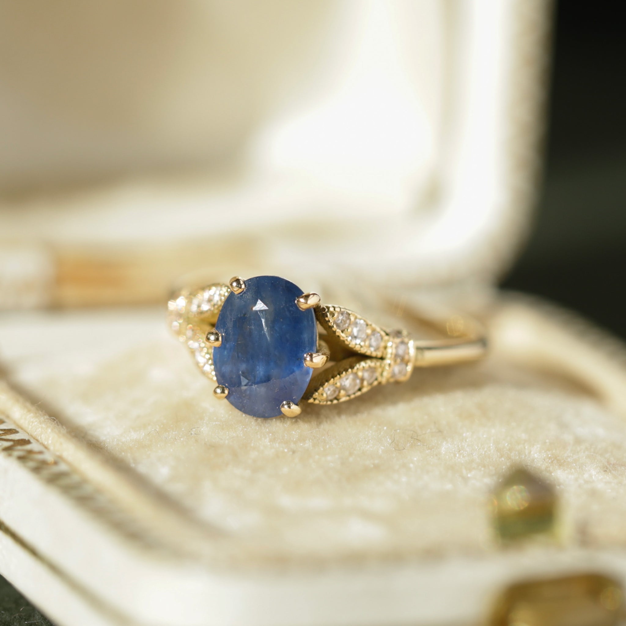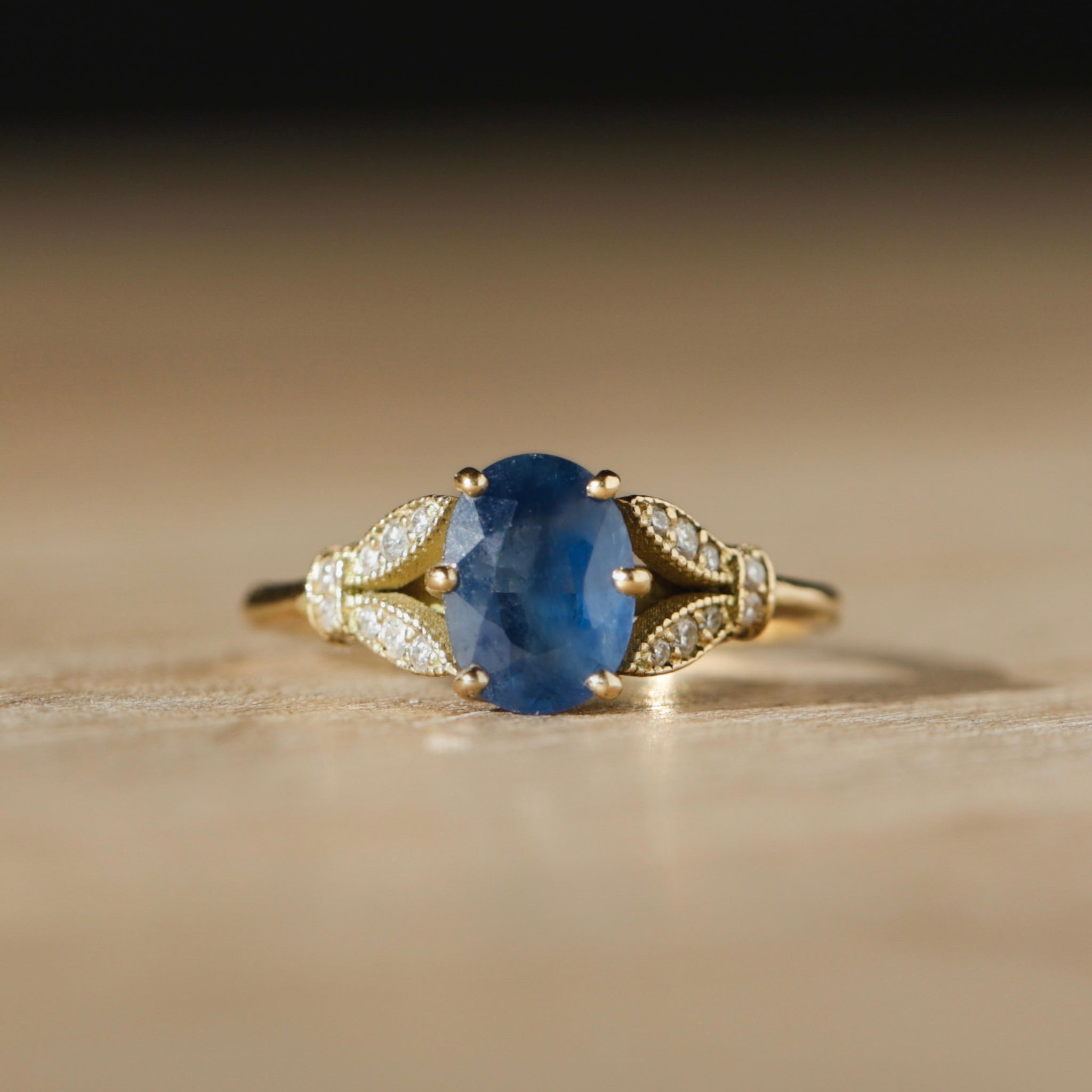 La bague Hesperis dépose une heure bleue sur la peau. Au centre, un saphir ovale au bleu profond semble retenir la lumière. Sur les côtés de l’anneau, deux feuilles pavées de diamants l’enlacent, comme un motif végétal retrouvé dans un bijou ancien. En or 18 carats recyclé, façonnée à la main, Hesperis transforme chaque geste en éclat discret, et chaque regard en secret.